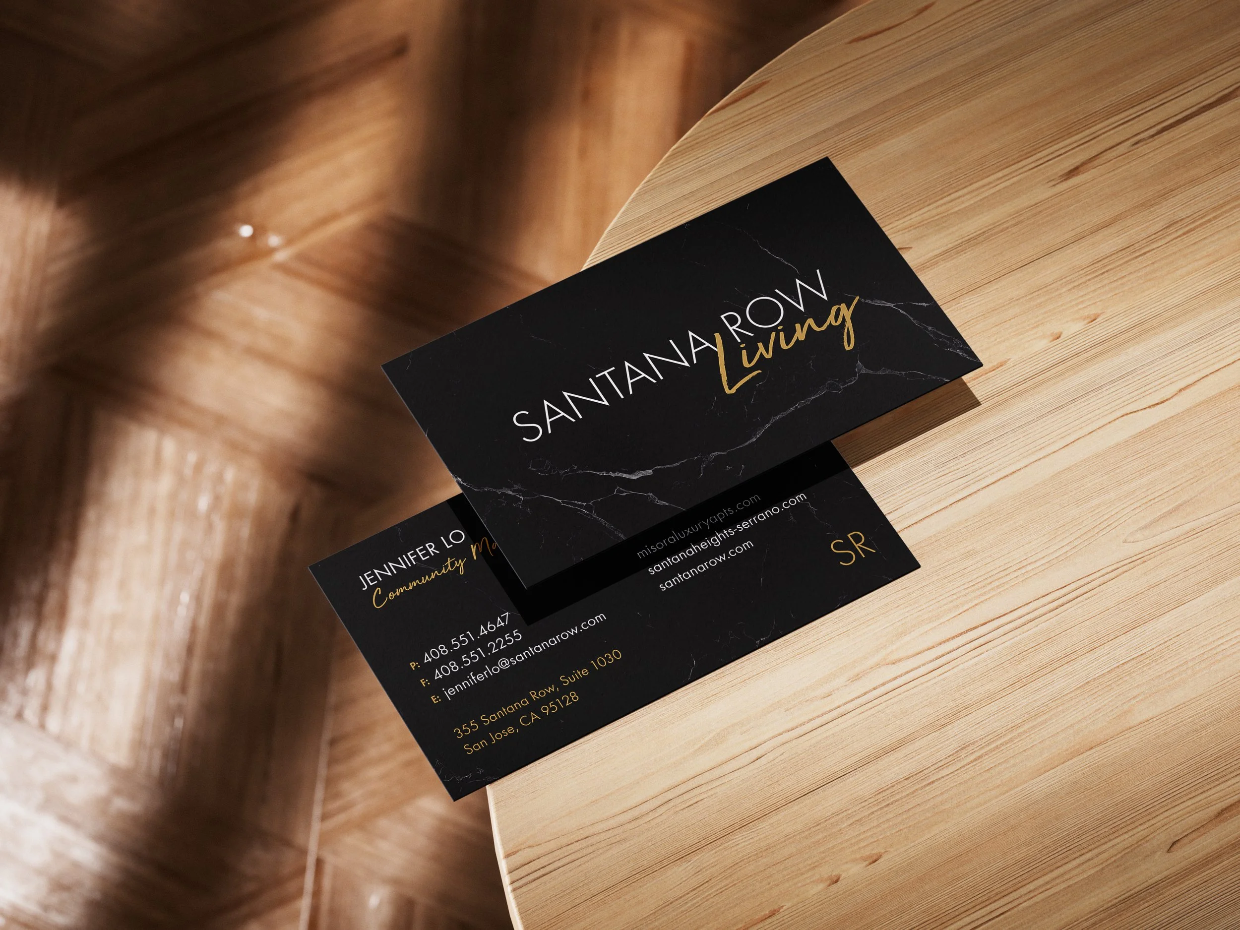 I designed a new suite of materials that redefined Santana Row Living with a modern, sophisticated look. This included updated business cards, social media posts, and large-scale window wraps to draw in shoppers and passersby. The refreshed identity features a black and gold palette with black marble textures, a repeating pattern made from the SR emblem, and an updated logo where “Living” appears in a handwritten script to convey elegance. These design choices gave Santana Row a polished, aspirational feel that speaks directly to the luxury experience of the property.